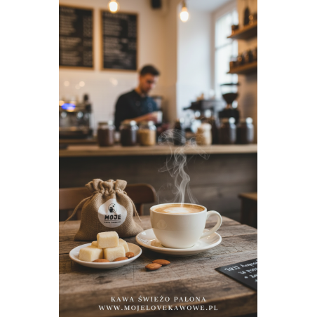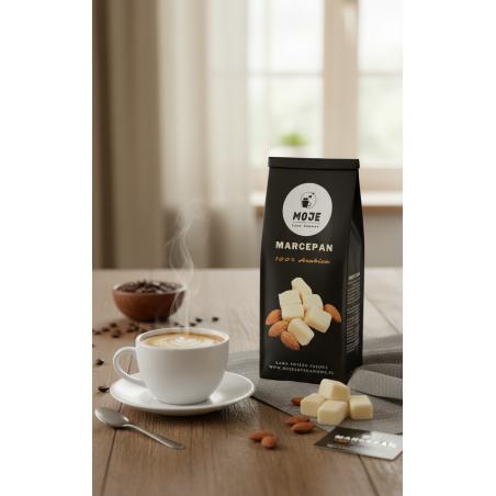 Marcepanowa kawa to uczta dla wszystkich miłośników słodkości oraz dobrej kawy. To idealne połączenie starannie wyselekcjonowanych ziaren, świeżo palonej,j Arabiki z uwodzicielskim akcentem słodkiego marcepanu. Prażone słodkie migdały to uczta dla podniebienia. Ta propozycja smakowa idealnie sprawdzi się zarówno w wersji klasycznej czarnej, jak również z dodatkiem mleka, śmietanki czy lodów.
