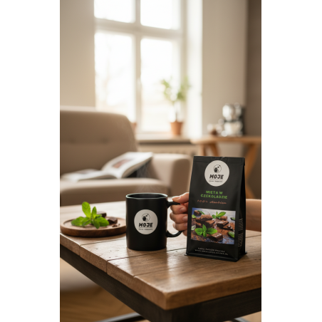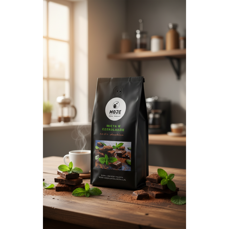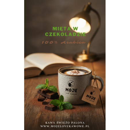 Składniki: kawa ziarnista 100% Arabika ( 98%), aromat (2%). Kraj pochodzenia:Kolumbia. Kawa o smaku gorzkiej czekolady połączonej z orzeźwiającą miętą. Nie zalecamy używania w ekspresach automatycznych.