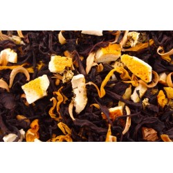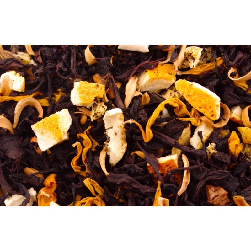 Składniki: herbata czarna Indie OP, suszony imbir (9%), pomarańcza liofilizowana, naturalne aromaty, płatki kwiatu pomarańczy, kwiat słonecznika.