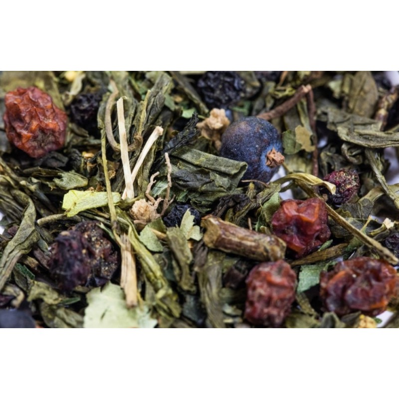 Składniki: herbata zielona Secha, kłącze perzu, liść brzozy, pokrzywy, jeżyny, poziomki, kwiat bzu czarnego, owoc jałowca, bzu czarnego i jarzębiny.