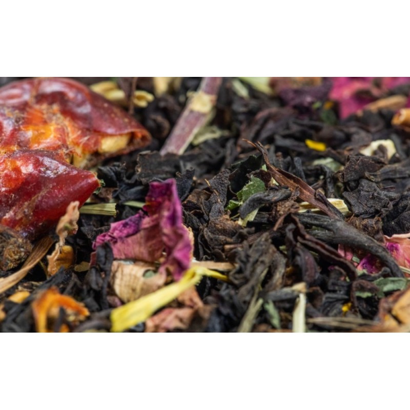 Składniki: herbata czarna Indie OP, owoc róży, owoc tarniny, ziele ostrożenia, ziele owsa, owoc rokitnika, ziele rzepiku, korzeń arcydzięgla, liść pokrzywy, liść jeżyny, różeniec kłącze, płatki róży, kwiat nagietka.