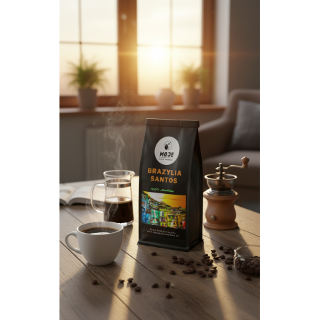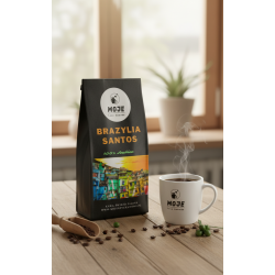 Brazylia jest największym eksporterem kawy na świecie. Kawa pochodząca z tego kraju stanowi około 1/3 światowego rynku kawy. Kawa Brazylia Santos przetwarzana jest na sucho, co oznacza, że ziarna są suszone, gdy są jeszcze w owocu. Ponieważ kawa jest suszona w kontakcie ze słodkim miąższem, profil smakowy kawy jest gęsty i słodki. Dodatkowo proponowana przez nas kawa posiada większe niż standardowo ziarna 17/18 a nie jak u większości innych producentów 14/16. Pamiętajmy, że im większe ziarna tym kawa jest wyższej jakości, co można odczuć już przy pierwszej filiżance kawy. Kawa posiada smak klasycznej czekolady przełamanej smakiem orzecha i palonego cukru. Kawa idealnie nadaje się do latte macchiato czy cappuciono.