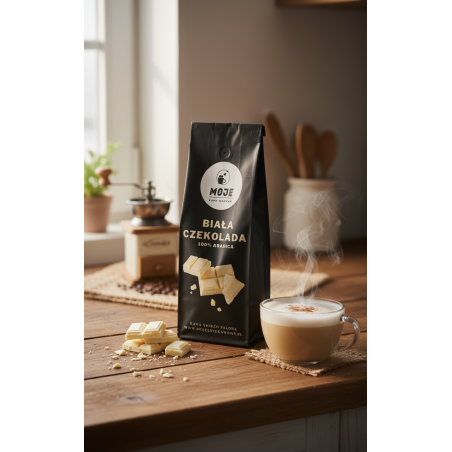 Kawa smakowa, świeżo palona na bazie 100% Arabiki o subtelnym aromacie białej czekolady. Aksamitne body, delikatna słodycz i kremowa nuta czekolady tworzą harmonijny smak — doskonały zarówno jako espresso, jak i w kawach mlecznych. Palona rzemieślniczo i aromatyzowana naturalnymi składnikami, to prawdziwa uczta dla miłośników kawy, która zaskoczy Cię intensywnością i głębią aromatu.